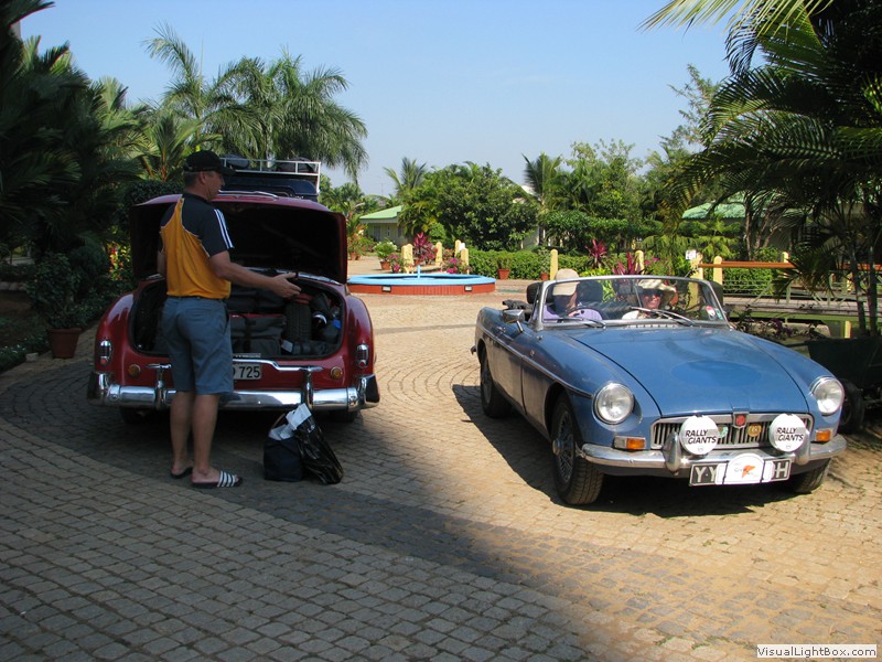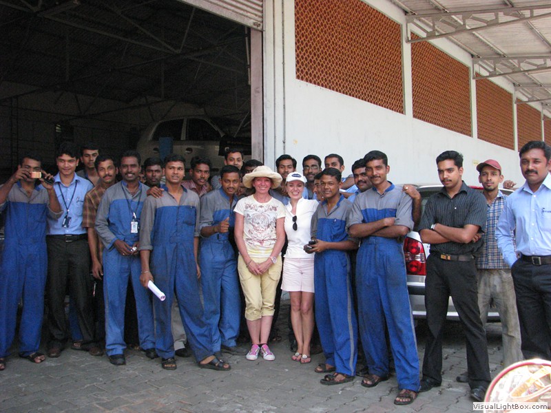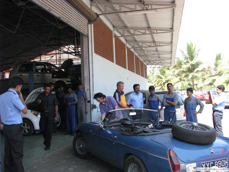 Für einige Stunden ging alles nach Plan, keine besonderen Vorkommnisse, mal abgesehen von fantastischen Wasserfällen und anderen Naturschauspielen. Doch dann ging’s los. Conrad, der Veranstalter, ist mit seinem MG unterwegs. Ein zuverlässiges Auto, bis es dann nicht mehr will. Die Gänge konnten plötzlich nicht mehr sauber eingelegt werden. Auch bei mir gab’s ein kleines, wenn auch nicht unbedeutendes Problem, mein Gaspedal klemmte. So steuerten wir eine moderne Fiat-Garage an. Natürlich waren wir gleich die Attraktion. Keiner arbeitete mehr, jeder stand um unsere Autos herum, Handys gezückt und wild drauflos fotografierend. Die „Reparatur“ an meinem Auto dauerte 10 Sekunden. Ein bisschen WD40 hier hin, ein bisschen da hin, schon lief alles wieder rund. Conrad’s Auto wurde untersucht und die Ursache schnell gefunden. Zuwenig Kupplungsflüssigkeit! Kurz aufgefüllt, entlüftet und schon war wieder alles in Butter. Und uns wurde versichert, dass es nirgends ein Leck hat, also nirgends Flüssigkeit auslaufen würde. Frohen Mutes machten wir uns wieder auf dem Weg und genossen die Fahrt. Es dauerte nur einige Kilometer bis bei Conrad’s Auto die Gänge wieder nur noch schwer einzulegen waren. In Munnar war es dann soweit, er konnte nicht mehr weiterfahren. So suchten wir eine Garage welche ihm weiterhelfen konnte. In Indien ist das so eine Sache. Nach einigem Fragen fanden wir dann eine die uns vielleicht helfen konnte. Dort angekommen untersuchten sie alles. Für unsere Verhältnisse sahen sie Jungs dort nicht sehr motiviert aus. Aber es ist sicher einfach in unserem Empfinden so. Zuerst machten sie den Masterzylinder als Fehlerquelle aus. Dies schlossen wir jedoch aus, da erstens keine Flüssigkeit austrat und zweitens dieser neu war. Also musste die Suche weitergehen. Das Auto wurde aufgebockt und der Mechaniker kroch darunter. Und siehe da, die wahre Ursache wurde gefunden, es war der Slavezylinder. Sie sagten sie könnten da nichts machen. Nachdem wir dann insistiert haben, haben sie das Teil ausgebaut und auseinander genommen. Schnell wurde klar woran es lag. Auch jetzt noch sagten sie es sei nichts zu machen. Jetzt waren Durchsetzungsvermögen und Ideen gefragt. Und an beidem mangelte es uns nicht. Die Idee: der MG ist ein Morris (MG = Morris Garage), auch die lokalen Ambassadors sind ursprünglich aus dem Hause Morris. Also liegt nichts näher als dass die Chance besteht, dass diese dieselben Teile einsetzen. Dies leuchtete dem Mechaniker ein und schon war er mit den Teilen verschwunden. Nach zwanzig Minuten kam er wieder an mit einer neuen Dichtung und etwas Dichtungsmittel. Das erstaunliche dabei war, dass die neue Dichtung sogar dieselbe Artikelnummer hatte wie die Alte. Nach einer weiteren halben Stunde war alles wieder zusammen- und eingebaut. Und siehe da, es funktionierte auf Anhieb. Super Arbeit Leute!!!